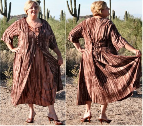 This short sleeve Duster Dress is an all-in-one dress. It has a 5 button faux front closure to make it look like two pieces, but it's not. In the back is an adjustable lace up that gives definition to the fit with an invisible zipper for easy on, off. The underdress is a ligher brown water effect than the outer dress (duster). Fabric Care: 100% Washable Batik Rayon, cold water, no bleach.